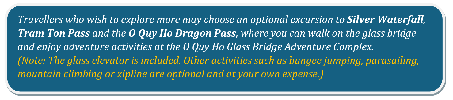 After breakfast, depart Sapa town by private car to begin the main sightseeing programme. Start with a visit to Cat Cat Village, home to the Black Hmong ethnic group. Enjoy an easy walk through scenic rice terraces, traditional wooden houses, craft workshops and the beautiful Cat Cat waterfall, while learning about the daily life and culture of the local community.